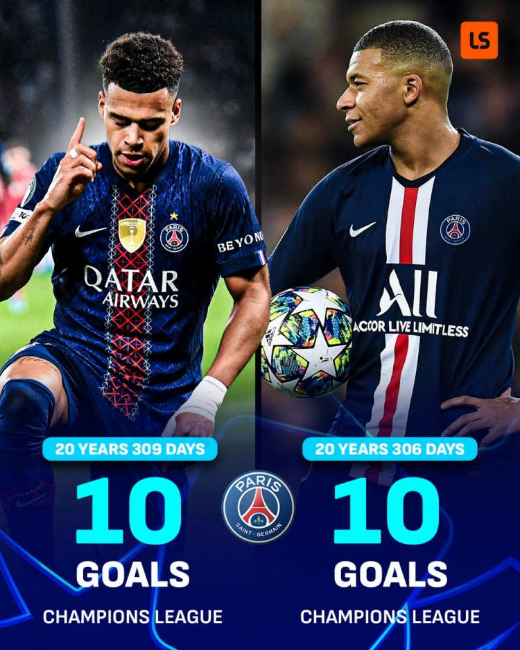 杜埃在欧冠已为巴黎打进10球,是姆巴佩后做到这一点的最年轻球员